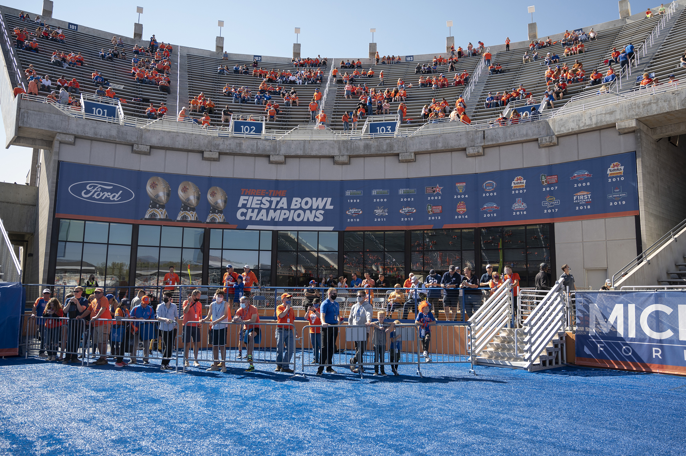 Redesign of Boise State football’s interior stadium signage to create a consistent theme of blue and orange to simplify sponsor logos and brand colors and eliminate visual noise in the background, while maintaining a professional look and feel.
